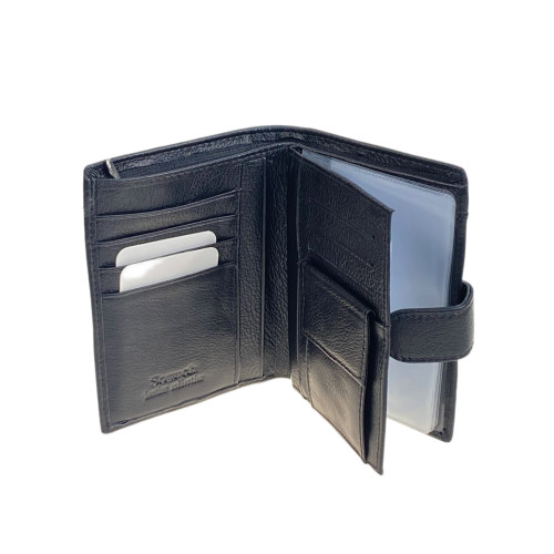 Многофункциональный мужской кошелёк-органайзер. Выполнен из натуральной кожи, вмещает деньги, пластиковые карты и различные документы. Кошелёк закрывается на горт с кнопкой. Внутри одно отделение под купюры с потайным карманом на молнии. На правом развороте обложка для паспорта, автодокументов, внутри пластиковый файл для водительского удостоверения, 4 файла для СРТС и сложенный файл формата A5 и 4 отсека для пластиковых карт. На левом развороте открытый кармана, карман для мелочи на магнитной кнопке и 7 отсеков для пластиковых карт.