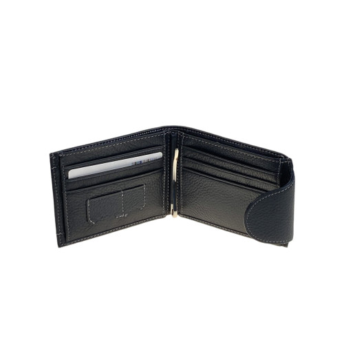 Мужское портмоне выполнен из натуральной кожи, вмещает деньги, пластиковые карты. Закрывается на грот с магнитной кнопкой, внутри одно отделение под купюры, потайной карман на молнии, 6 отсеков для пластиковых карт, и зажим для денег. Снаружи, на задней стенке карман на молнии.