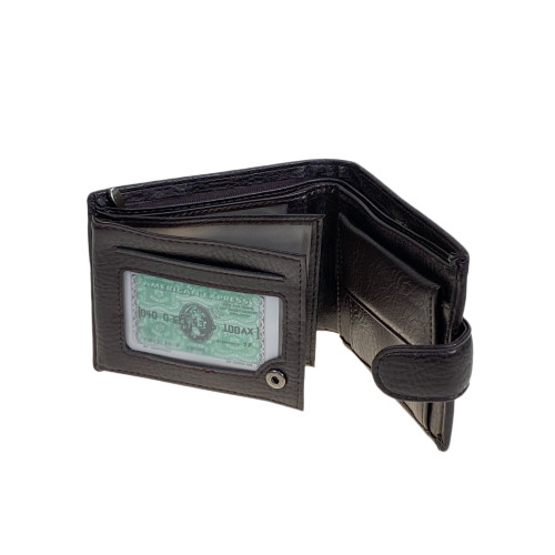 Мужское портмоне выполнен из натуральной кожи, вмещает деньги, пластиковые карты. Закрывается на грот с магнитной кнопкой, внутри два отделения под купюры, потайной карман на молнии, 3 отсекf для пластиковых карт, отделение для мелочи на магнитной кнопке, и 3 отсека с пластиковым окном.