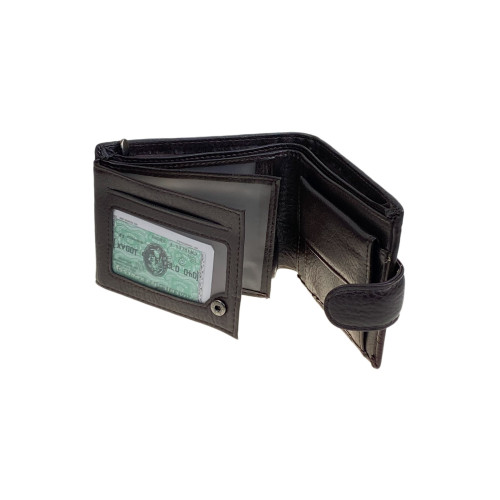 Мужское портмоне выполнен из натуральной кожи, вмещает деньги, пластиковые карты. Закрывается на грот с магнитной кнопкой, внутри два отделения под купюры, потайной карман на молнии, 3 отсекf для пластиковых карт, отделение для мелочи на магнитной кнопке, и 3 отсека с пластиковым окном.