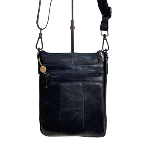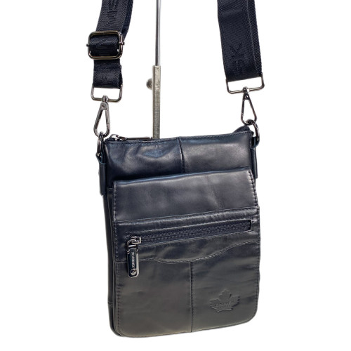 Функциональная мужская сумка из натуральной кожи. Сумка закрывается на молнию, внутри одно основное отделение, дополнительный открытый карман и карман на молнии. Снаружи, на передней стенке карман с клапаном на магнитной кнопке и прорезной карман на молнии. На задней стенке карман на молнии. В комплекте текстильный плечевой ремень.