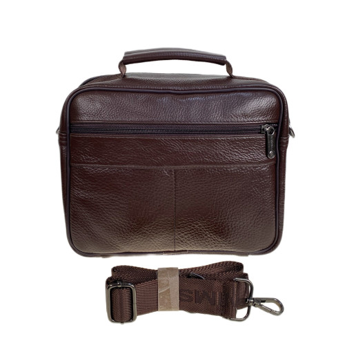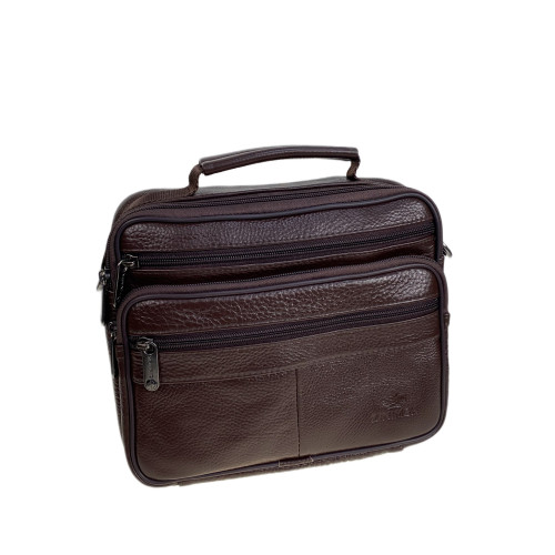 Функциональная мужская сумка из натуральной кожи. Сумка закрывается на молнию, внутри одно основное отделение и карман на молнии. Снаружи, на передней стенке три кармана на молнии. На задней стенке карман на молнии. В комплекте текстильный плечевой ремень и ручка.