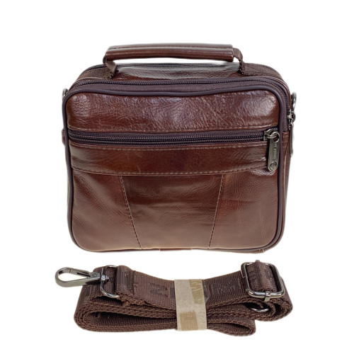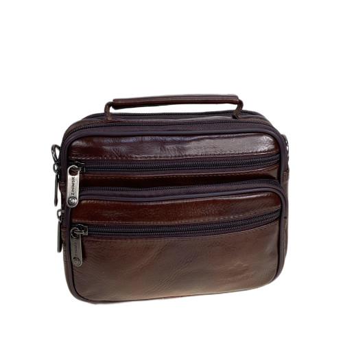 Функциональная мужская сумка из натуральной кожи. Сумка имеет два отделения, каждое застегивается на молнию. Снаружи, на передней стенке три кармана на молнии. На задней стенке карман на молнии. В комплекте текстильный плечевой ремень.