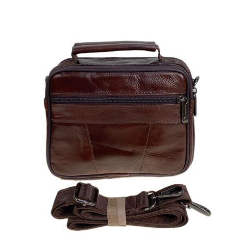 Функциональная мужская сумка из натуральной кожи. Сумка имеет два отделения, каждое застегивается на молнию. Снаружи, на передней стенке два кармана на молнии и карман с клапаном на магнитной кнопке. На задней стенке карман на молнии. В комплекте текстильный плечевой ремень.