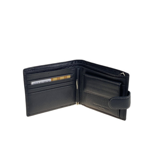 Мужское портмоне выполнен из натуральной кожи, вмещает деньги, пластиковые карты. Закрывается на грот с магнитной кнопкой, внутри два отделения под купюры, потайной карман на молнии, 4 отсека для пластиковых карт, отделение для мелочи на магнитной кнопке.
