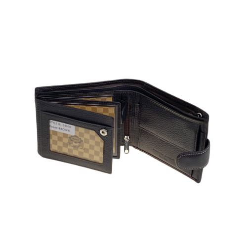 Мужское портмоне выполнен из натуральной кожи, вмещает деньги, пластиковые карты. Закрывается на грот с магнитной кнопкой, внутри два отделения под купюры, потайной карман на молнии, 3 отсека для пластиковых карт, отделение для мелочи на магнитной кнопке, и три отсека с пластиковым окном.