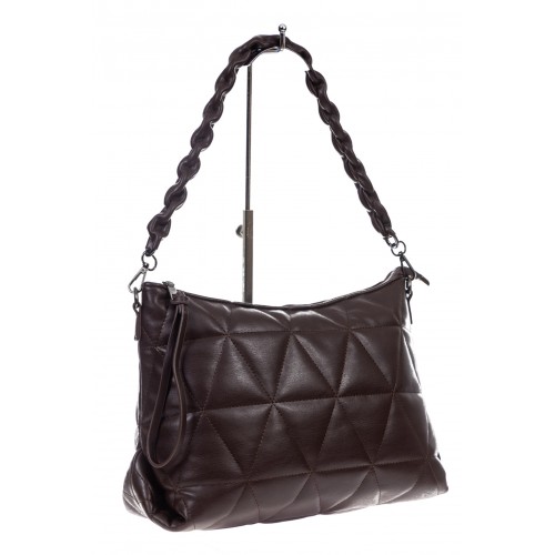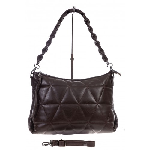 Женская сумка из мягкой искусственной кожи. В комплекте плечевой ремень, регулируется по длине, ручка сьемная. Сумка застёгивается на молнию, внутри два отделения с перегородкой на молнии, карман на молнии и два открытых кармана. Цвет сумки коричневый. Размер сумки L