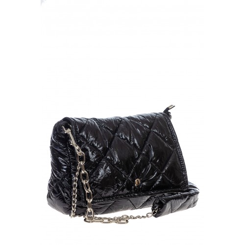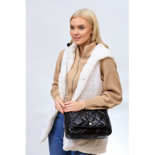 Практичная женская сумка из водооталкивающей ткани. Основное отделение застегивается клапаном на магнитную кнопку и молнией, внутри открытый карман и карман на молнии, куда можно положить паспорт или ключи. Удобная ручка-цепочка комфортно лежит на плече.Цвет сумки черный. Размер сумки S