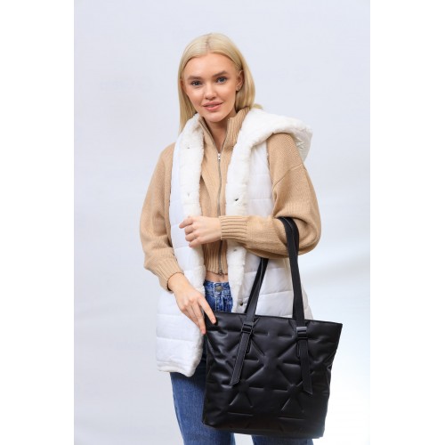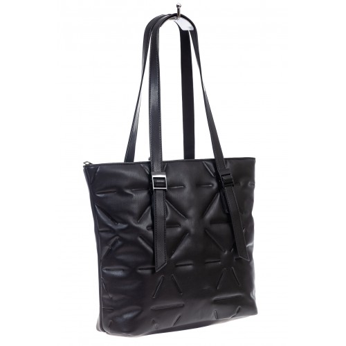 Вместительная женская сумка тоут из искусственной кожи. Длинные ручка регулируются по длине. В комплекте длинный плечевой ремень. Сумка застёгивается на молнию, внутри два отделения с перегородкой на молнии, карман на молнии. Снаружи, на задней стенке, карман на молнии. Цвет сумки черный. Размер XL.