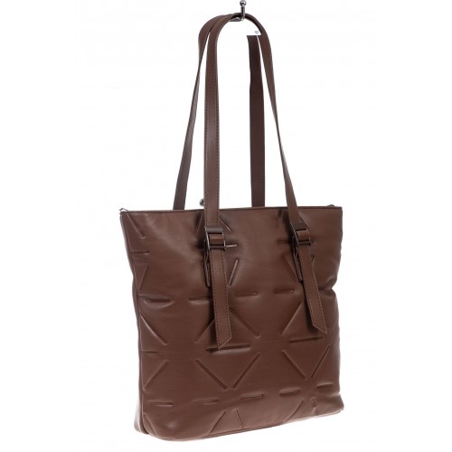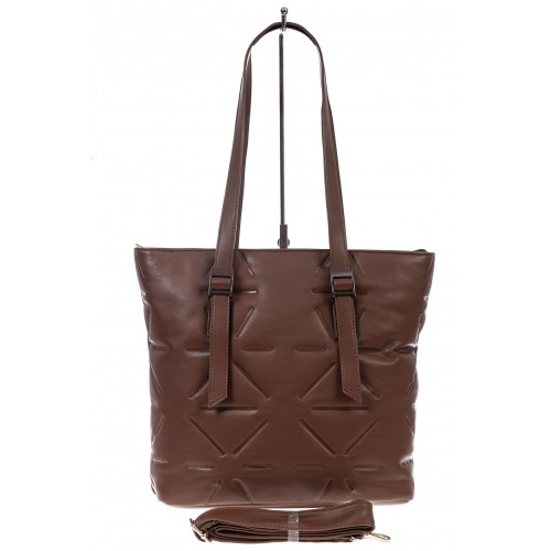Вместительная женская сумка тоут из искусственной кожи. Длинные ручка регулируются по длине. В комплекте длинный плечевой ремень. Сумка застёгивается на молнию, внутри два отделения с перегородкой на молнии, карман на молнии. Снаружи, на задней стенке, карман на молнии. Цвет сумки коричневый. Размер XL.