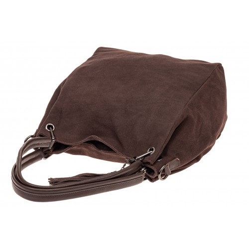 Вместительная женская сумка из натуральной мягкой замши. Дно модели, пара ручек средней длины и наплечный ремень с текстильной лентой выполнены из натуральной кожи. Фронтальная часть украшена съемной подвеской-кистью на цепочке.