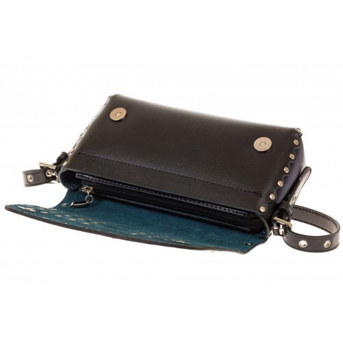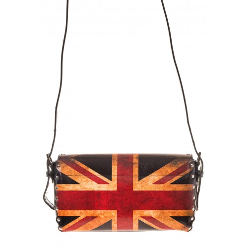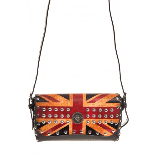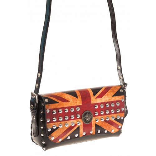 Молодежная сумка baguette bag из натуральной кожи. Качественная стилизация под винтажную роковую модель: черная натуральная кожа обильно украшена металлическими клепками и принтом потертого британского флага на тыльной и фронтальной стороне. Длинный кожаный ремешок позволяет носить сумку через плечо, как кросс-боди.
