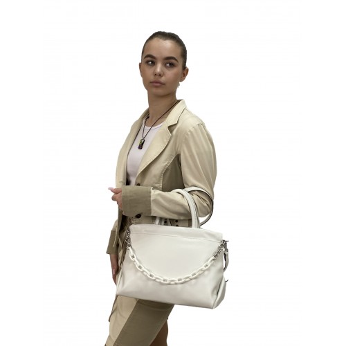 Аккуратная и элегантная сумка. Выполнена из натуральной кожи. Сумка имеет длинный ремень через плечо, который крепится на карабин, снимается и регулируется. Небольшой акцент – ручка-цепочка. Закрывается на молнию, внутри два отделения с медианой на молнии, карман на молнии и открытый карман. На задней стенке карман на молнии. Цвет сумки белый, размер M.