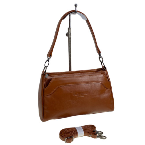 Компактная и стильная женская сумка из качественной натуральной кожи. Сумка имеет три отделения, центральное закрывается на молнию, два других, на магнитную кнопку внутри дополнительный карман на молнии и открытый карман. В комплекте удлиненная ручка и длинный плечевой ремень.