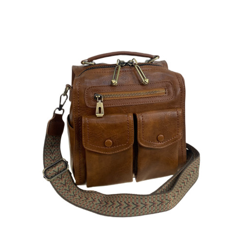 Компактная женская сумка-рюкзак из искусственной кожи. Сумка закрывается на молнию, внутри два кармана на молнии и открытый карман. Снаружи на передней стенке карман на молнии и два накладных кармана на магнитных кнопках. На задней стенке два ремня и карман на молнии. В комплекте широкий текстильный плечевой ремень .