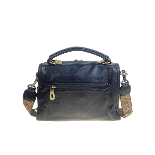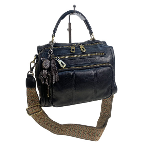 Компактная женская сумка из искусственной кожи. Сумка закрывается на молнию, внутри дополнительный карман на молнии и открытый карман. Снаружи на передней стенке два отделения на молнии. На задней стенке карман на молнии. В комплекте широкий текстильный ремень и оригинальный брелок.