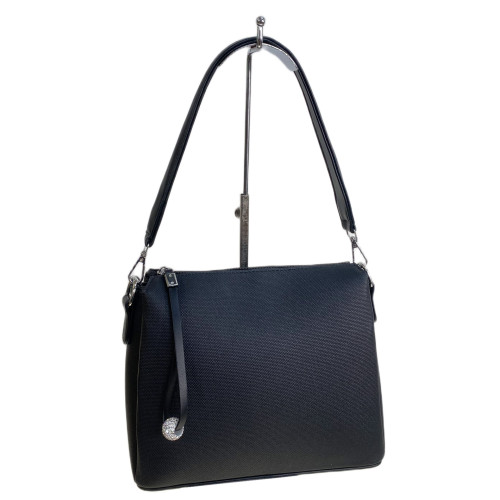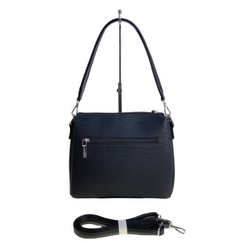 Компактная женская сумка из искусственной кожи. Сумка закрывается на молнию, внутри три отделения: центральное отделение на молнии с карманом на молнии и открытым карманом и два открытых отделения. Снаружи на задней стенке карман на молнии. В комплекте удлиненная ручка и длинный плечевой ремень.