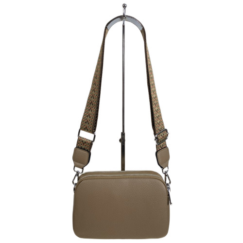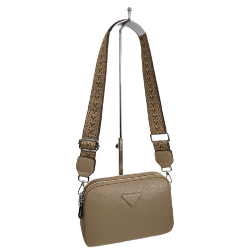 Комактная женская сумка из искусственной кожи. Сумка имеет два отделения, каждое закрывается на молнию, внутри дополнительный открытый карман и карман на молнии. В комплекте широкий текстильный плечевой ремень.