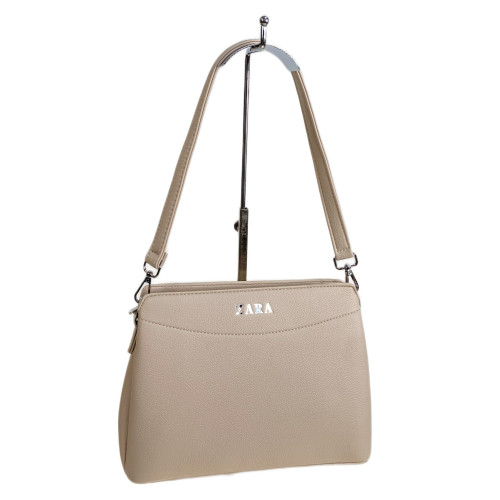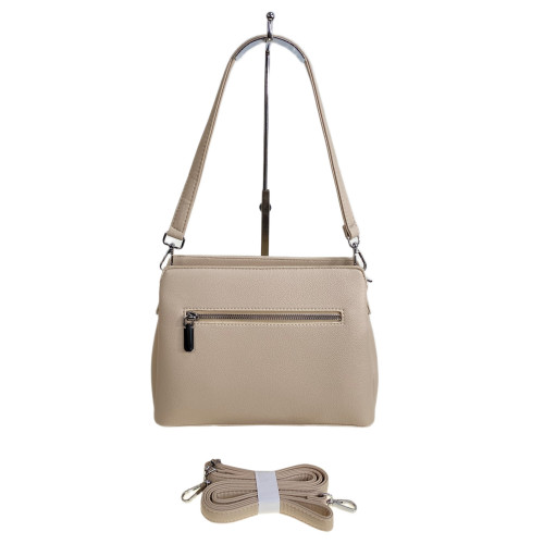 Компактная женская сумка из искусственной кожи. Сумка закрывается на молнию, внутри три отделения разделенных карманом на молнии, дополнительный карман на молнии. Снаружи на задней стенке карман на молнии. В комплекте удлиненная ручка и длинный плечевой ремень.