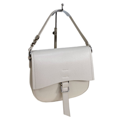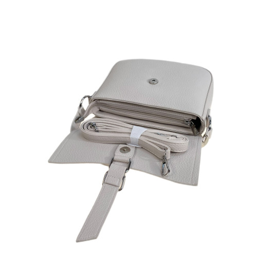 Компактная женская сумка из искусственной кожи. Сумка закрывается на клапан с магнитной кнопкой и молнию, внутри одно основное отделение, дополнительный карман на молнии и открытый карман. Снаружи на задней стенке карман на молнии. В комплекте удобная ручка и длинный плечевой ремень.