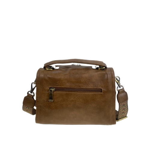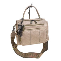 Компактная женская сумка из искусственной кожи. Сумка закрывается на молнию, внутри дополнительный карман на молнии и открытый карман. Снаружи на передней стенке два отделения на молнии. На задней стенке карман на молнии. В комплекте широкий текстильный ремень и оригинальный брелок.