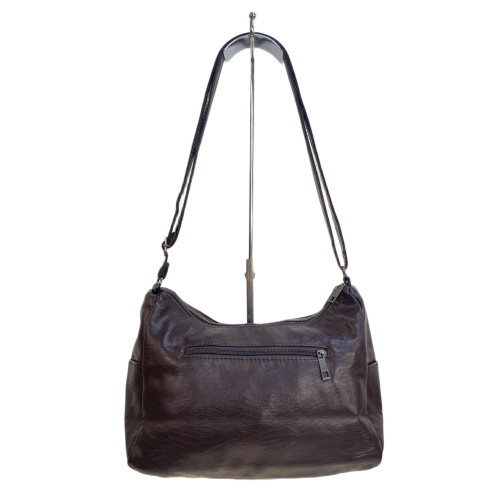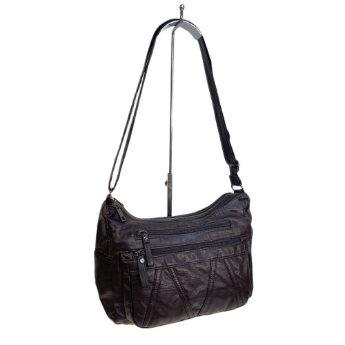 Женская сумка из мягкой искусственной кожи. Сумка имеет одну ручку, регулируется по длине, удобно носить на плече или через плечо. Сумка имеет два отделения, каждое закрывается на молнию. Внутри карман на молнии. На фронтальной стороне два прорезных кармана на молнии. На задней стороне карман на молнии. По бокам сумки с двух сторон, открытые накладные карманы.