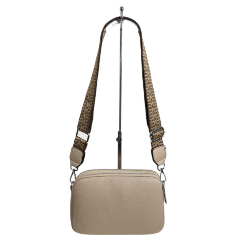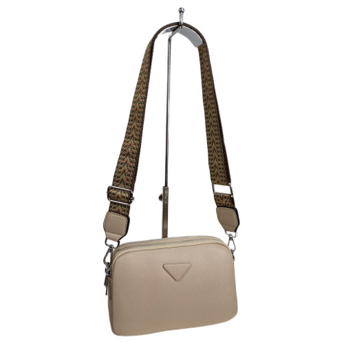 Комактная женская сумка из искусственной кожи. Сумка имеет два отделения, каждое закрывается на молнию, внутри дополнительный открытый карман и карман на молнии. В комплекте широкий текстильный плечевой ремень.