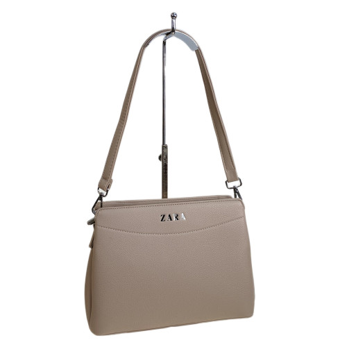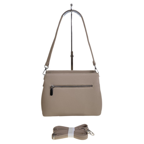 Компактная женская сумка из искусственной кожи. Сумка закрывается на молнию, внутри три отделения разделенных карманом на молнии, дополнительный карман на молнии. Снаружи на задней стенке карман на молнии. В комплекте удлиненная ручка и длинный плечевой ремень.