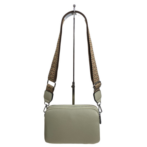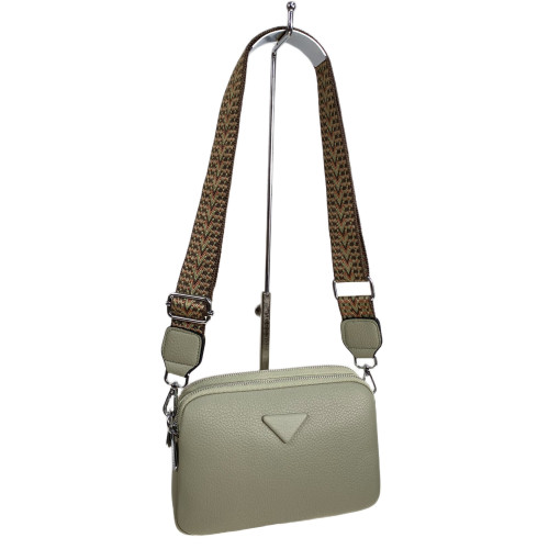 Комактная женская сумка из искусственной кожи. Сумка имеет два отделения, каждое закрывается на молнию, внутри дополнительный открытый карман и карман на молнии. В комплекте широкий текстильный плечевой ремень.