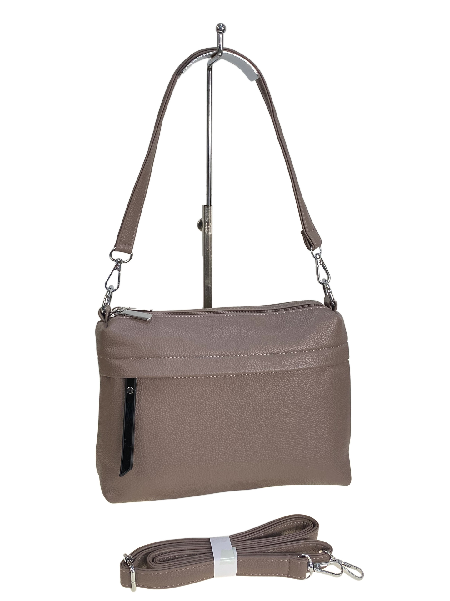 Элегантная женская сумка из мягкой искусственной кожи. Сумка имеет два отделения, каждое закрывается на молнию, внутри дополнительный карман на молнии и два открытых кармана. Снаружи, на передней стенке прорезной карман на молнии. На задней стенке карман на молнии. В комплекте удобная ручка и длинный плечевой ремень.