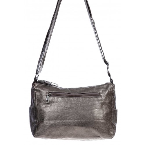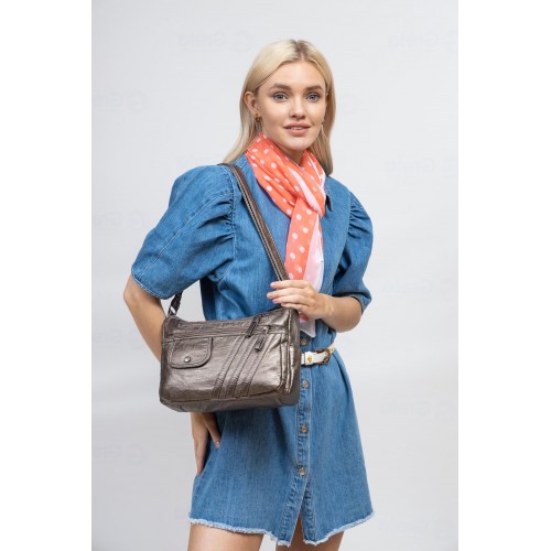 Оригинальная женская сумка из мягкой искусственной кожи. В комплекте плечевой ремень, регулируется по длине.Сумка имеет два отделения, каждое закрывается на молнию, внутри карман на молнии .Снаружи, на задней стенке, карман на молнии. На передней стенке два прорезных кармана на молнии. По бокам два открытых кармана. Цвет золото, размер М.