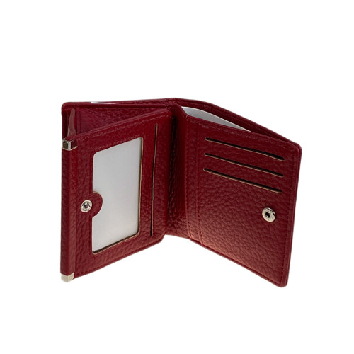 Компактный женский кошелёк из натуральной кожи. Закрывается на магнитную кнопку, внутри отделение под купюры, на развороте: 3 отсека для пластиковых карт, 2 открытых отделения, 1 отделение с пластиковым окном. Снаружи отделение для мелочи на магнитной кнопке.