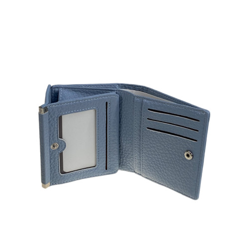 Компактный женский кошелёк из натуральной кожи. Закрывается на магнитную кнопку, внутри отделение под купюры, на развороте: 3 отсека для пластиковых карт, 2 открытых отделения, 1 отделение с пластиковым окном. Снаружи отделение для мелочи на магнитной кнопке.
