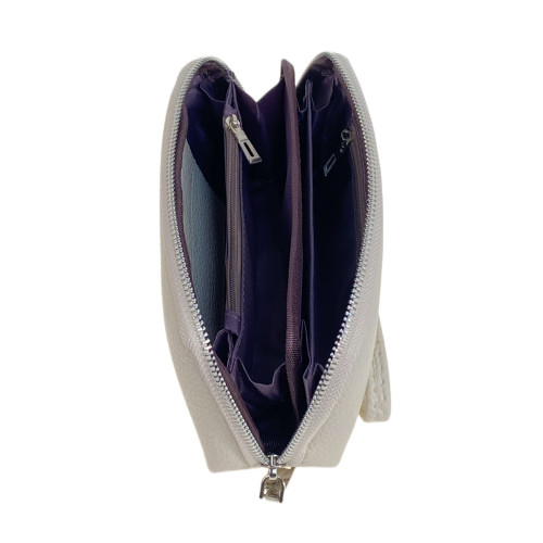 Компактный женский кошелёк из натуральной кожи. Закрывается на круговую молнию, внутри четыре открытых отделения под купюры, два отделения на молнии, 2 отсека для пластиковых карт. В комплекте ремешок.