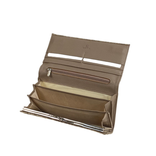 Женский кошелёк из натуральной кожи. Закрывается на скрытую магнитную кнопку, внутри 3 открытых отделения под купюры, отделение с фермуаром. На верхнем развороте открытое отделение, отделение на молнии, 4 отсека для карт. На нижнем развороте 4 отсека для карт. Снаружи на задней стенке открытое отделение.