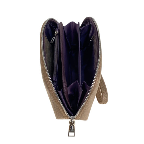 Компактный женский кошелёк из натуральной кожи. Закрывается на круговую молнию, внутри четыре открытых отделения под купюры, два отделения на молнии, 2 отсека для пластиковых карт. В комплекте ремешок.
