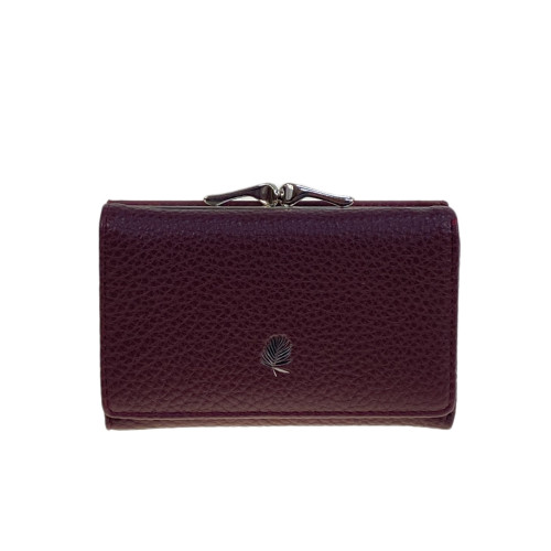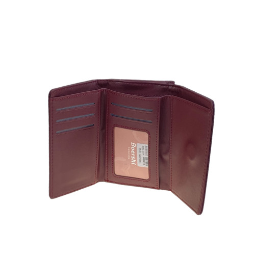 Компактный женский кошелёк из искусственной кожи. Кошелёк закрывается на кнопку. Внутри одно полноразмерное отделение под купюры, 6 отсеков для карт и три небольших открытых отделения. Снаружи отделение с фермуаром.