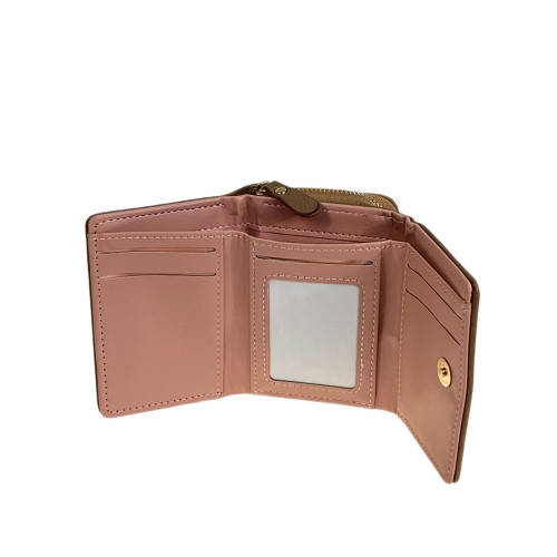 Компактный женский кошелёк из искусственной кожи. Закрывается на магнитную кнопку, внутри отделение под купюры, 5 отсеков для карт. Снаружи, отделение на молнии.