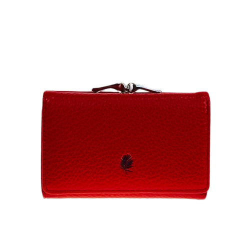 Компактный женский кошелёк из искусственной кожи. Кошелёк закрывается на кнопку. Внутри одно полноразмерное отделение под купюры, 6 отсеков для карт и три небольших открытых отделения. Снаружи отделение с фермуаром.