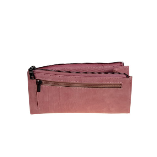 Женский кошелёк из искусственной кожи. Кошелёк закрывается на молнию. Внутри полноразмерное отделения под купюры, два отделения на молнии и 8 отсеков для пластиковых карт. Снаружи карман на молнии.