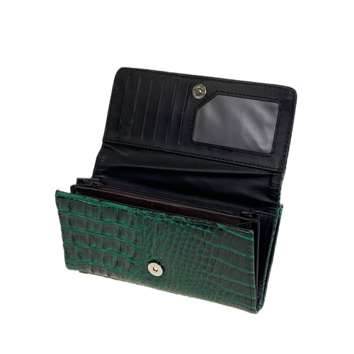 Полноразмерный женский кошелёк из искусственной кожи. Кошелёк закрывается на магнитную кнопку. Внутри три отделения под купюры, отделение на молнии, на верхнем развороте открsnjt отделение и 6 отсеков для карт. Снаружи отделение с фермуаром.