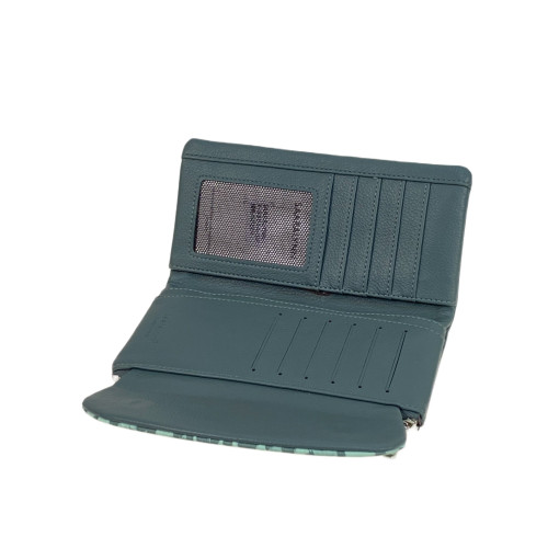 Полноразмерный женский кошелёк из искусственной кожи. Кошелёк закрывается на клапан со скрытыми магнитными кнопками. Внутри три отделения под купюры и 11 отсеков для карт. Снаружи отделение на молнии.