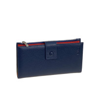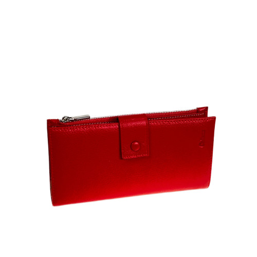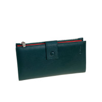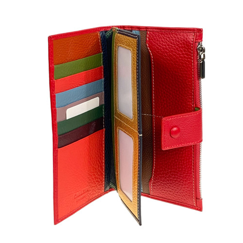 Полноразмерный женский кошелёк из натуральной кожи. Кошелёк закрывается на грот с магнитной кнопкой. Внутри пять отделений под купюры, 17 отсеков для карт и два отсека с пластиковым окном. Снаружи отделение на молнии.