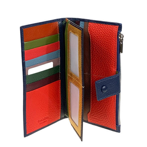 Полноразмерный женский кошелёк из натуральной кожи. Кошелёк закрывается на грот с магнитной кнопкой. Внутри пять отделений под купюры, 17 отсеков для карт и два отсека с пластиковым окном. Снаружи отделение на молнии.