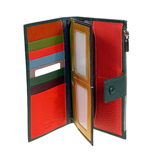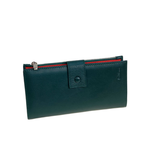 Полноразмерный женский кошелёк из натуральной кожи. Кошелёк закрывается на грот с магнитной кнопкой. Внутри пять отделений под купюры, 17 отсеков для карт и два отсека с пластиковым окном. Снаружи отделение на молнии.