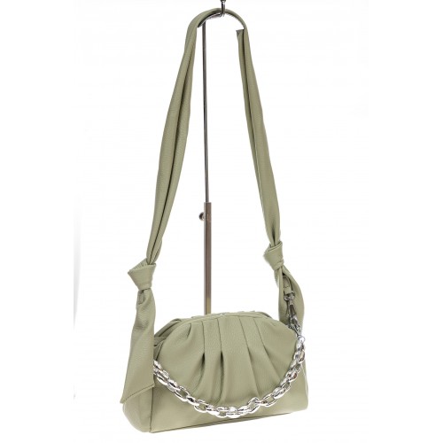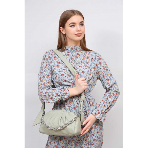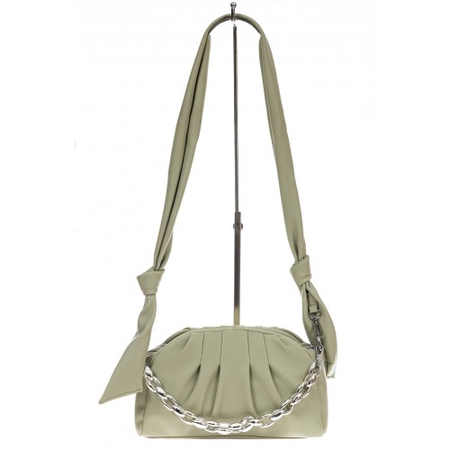 Женская сумка из очень мягкой искусственной кожи. В комплекте съемный плечевой ремень и короткая ручка-цепочка с крупными звеньями. Сумка имеет два отделения, разделенных карманом на молнии, с карманом на молнии и открытым карманом. Цвет сумки оливковый, размер S/